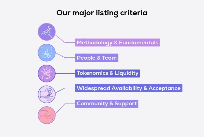 Our asset onboarding team evaluates crypto on various criteria—from methodology and fundamentals to community and support—to decide if and what cryptos we should list, and when. The broad listing evaluation criteria have been detailed below this article. Do note, this is not an exhaustive list and the decision is ultimately on CoinSwitch, even if a crypto meets the below-mentioned criteria.