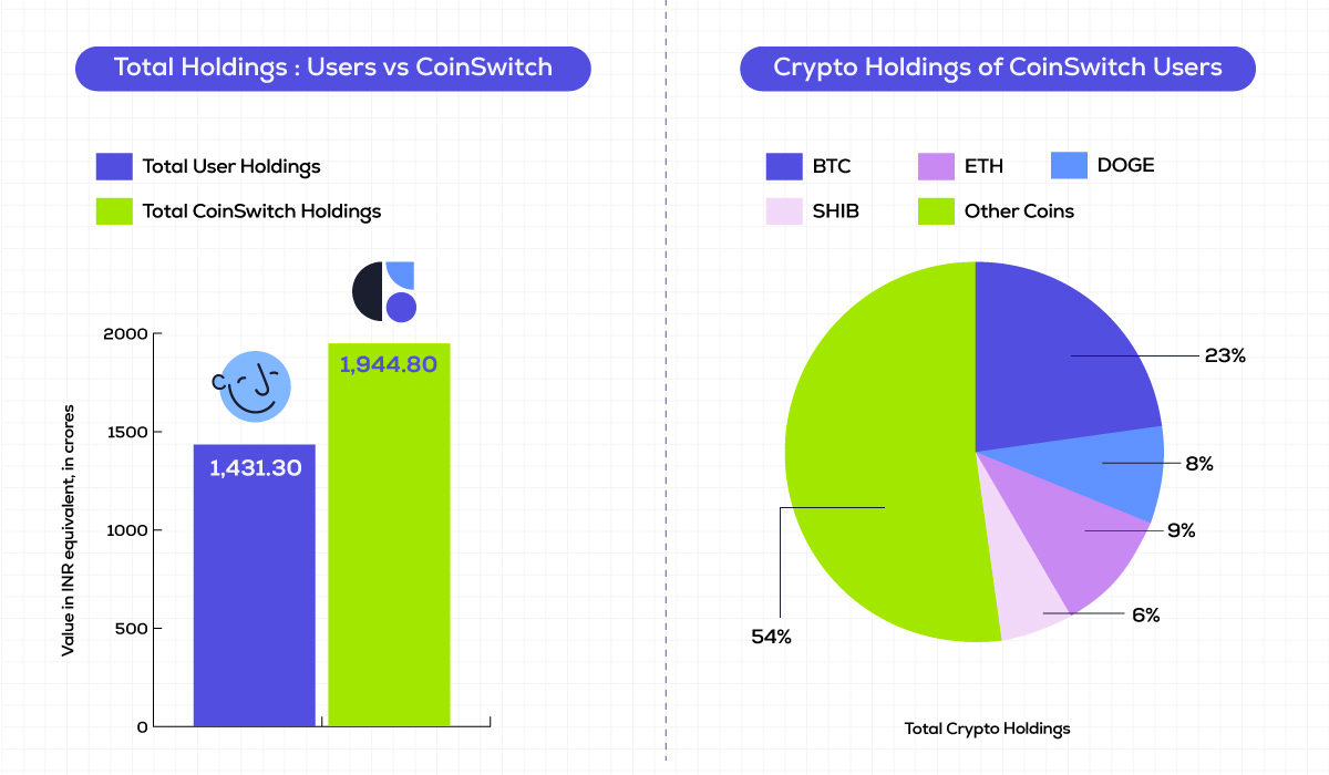 - CoinSwitch’s total holdings are greater than its users’. The INR value of the total holdings, including crypto and fiat, of the users is Rs 1431.30 crore; the INR value of the total holdings of CoinSwitch, including crypto and fiat, is Rs 1944.8 crore.