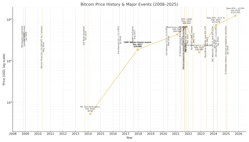 This timeline reflects more than price. It shows how trust, technology, and time shaped a new financial path. Each halving, each headline, each high and low added weight to Bitcoin’s story.